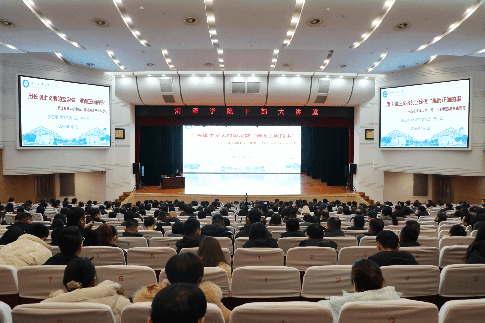 1月6日上午,我校在艺术中心演播厅举办干部大讲堂,特邀浙江海洋大学党委书记、国际欧亚科学院院士、博士生导师严小军教授莅临指导并作专题报告。校党委书记黄富峰主持会议,全校600余名领导干部及教师代表到场聆听。